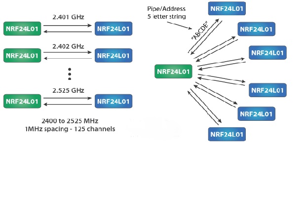 Each channel has up to 6 addresses that means it can communicate with 6 other devices simultaneously. As we can see in the diagram one NRF module communicating with six channel at a time also we can see the channel spacing of the NRF module.